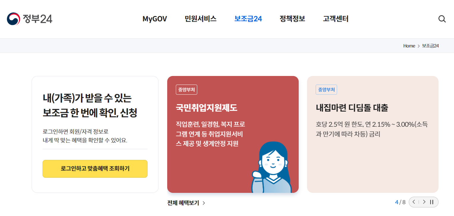 '정부24'에서 제공하는 ‘보조금24’를 이용하면 내가 받을 수 있는 모든 정부지원금을 한 번에 확인할 수 있습니다. 내가 놓치고 있는 지원금이 없는지 지금 바로 확인해 보세요.